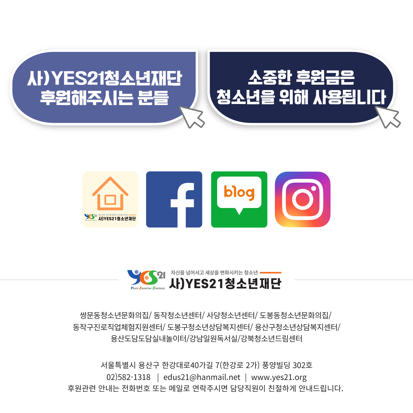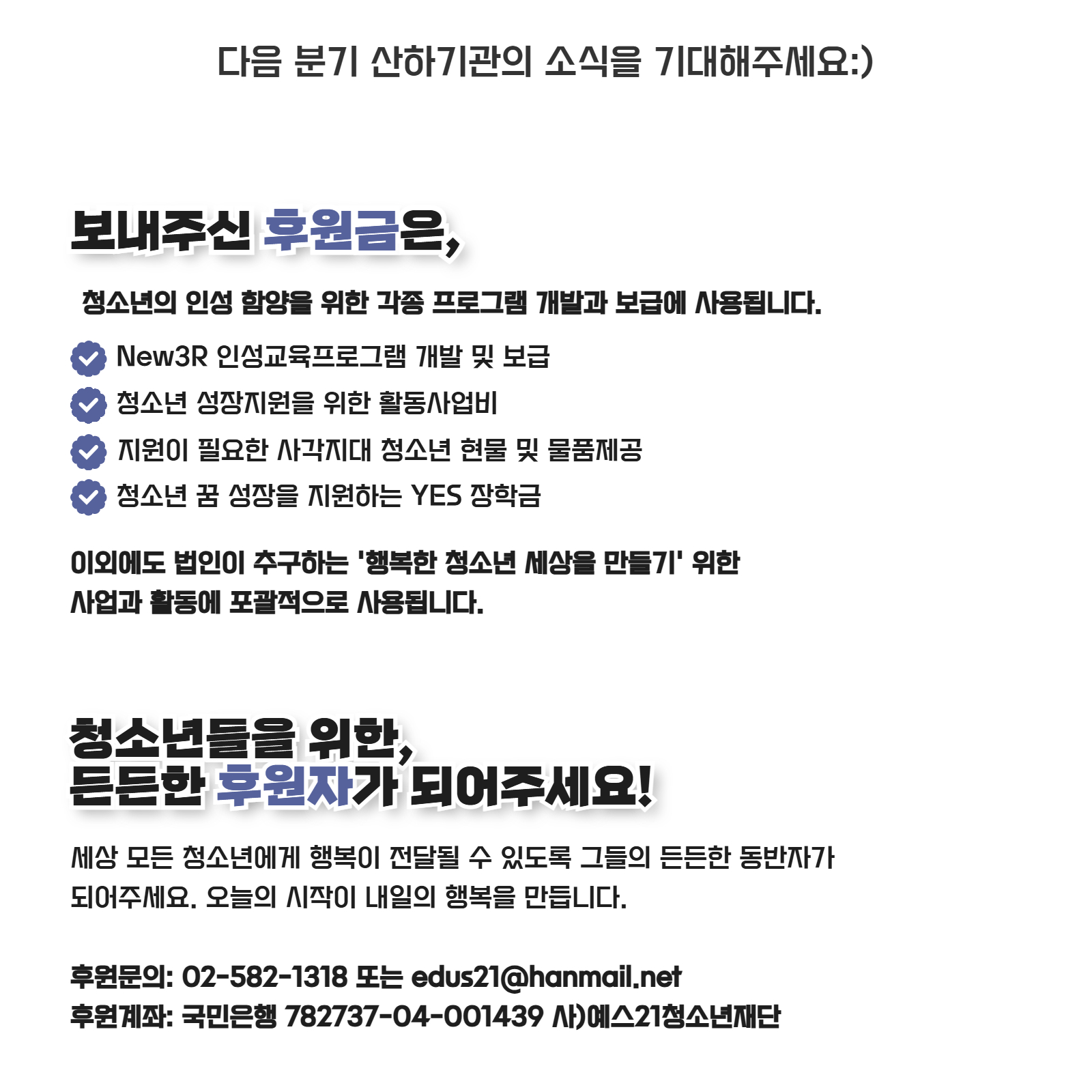 예금주 : 사단법인 예스21청소년재단